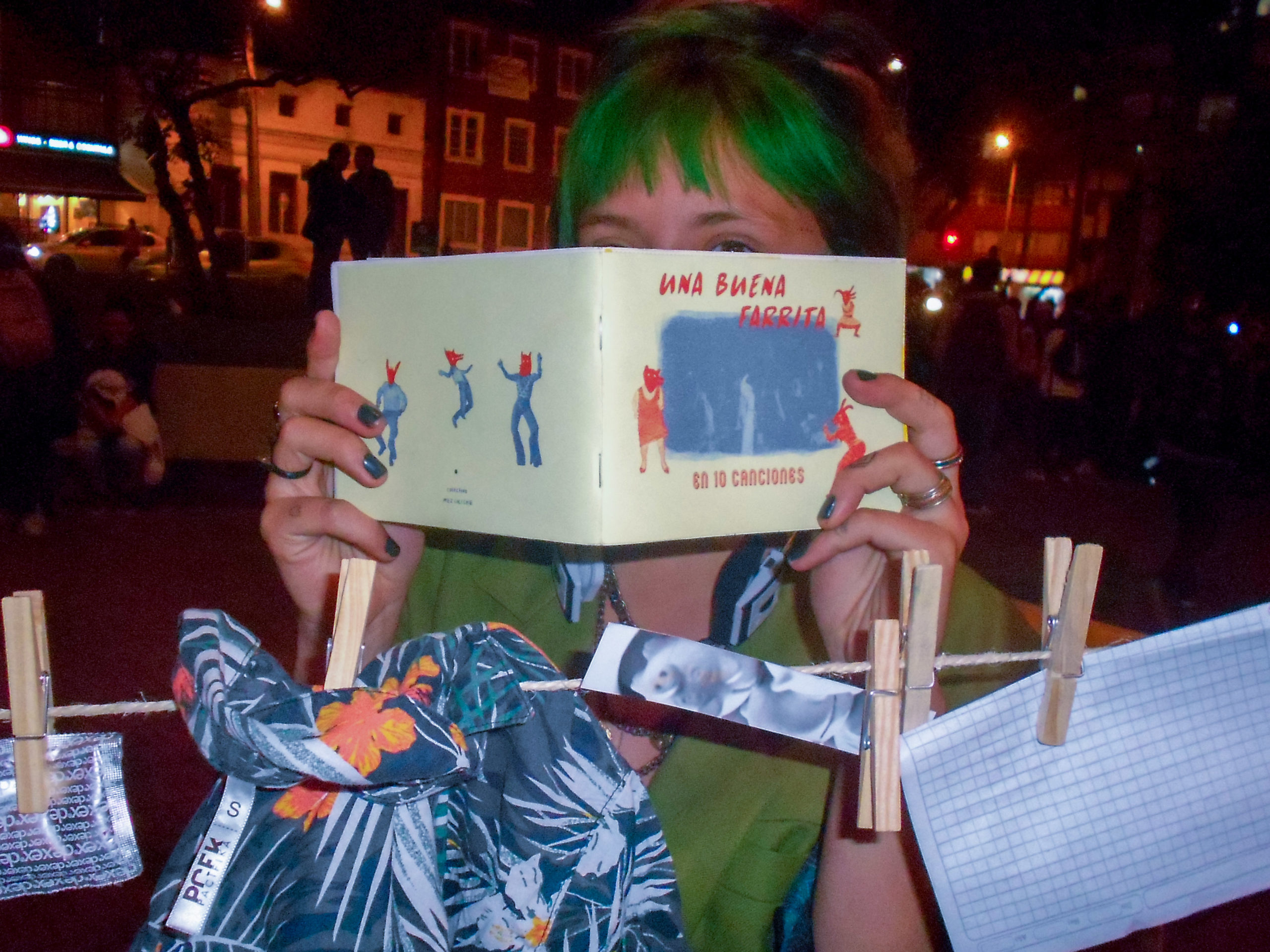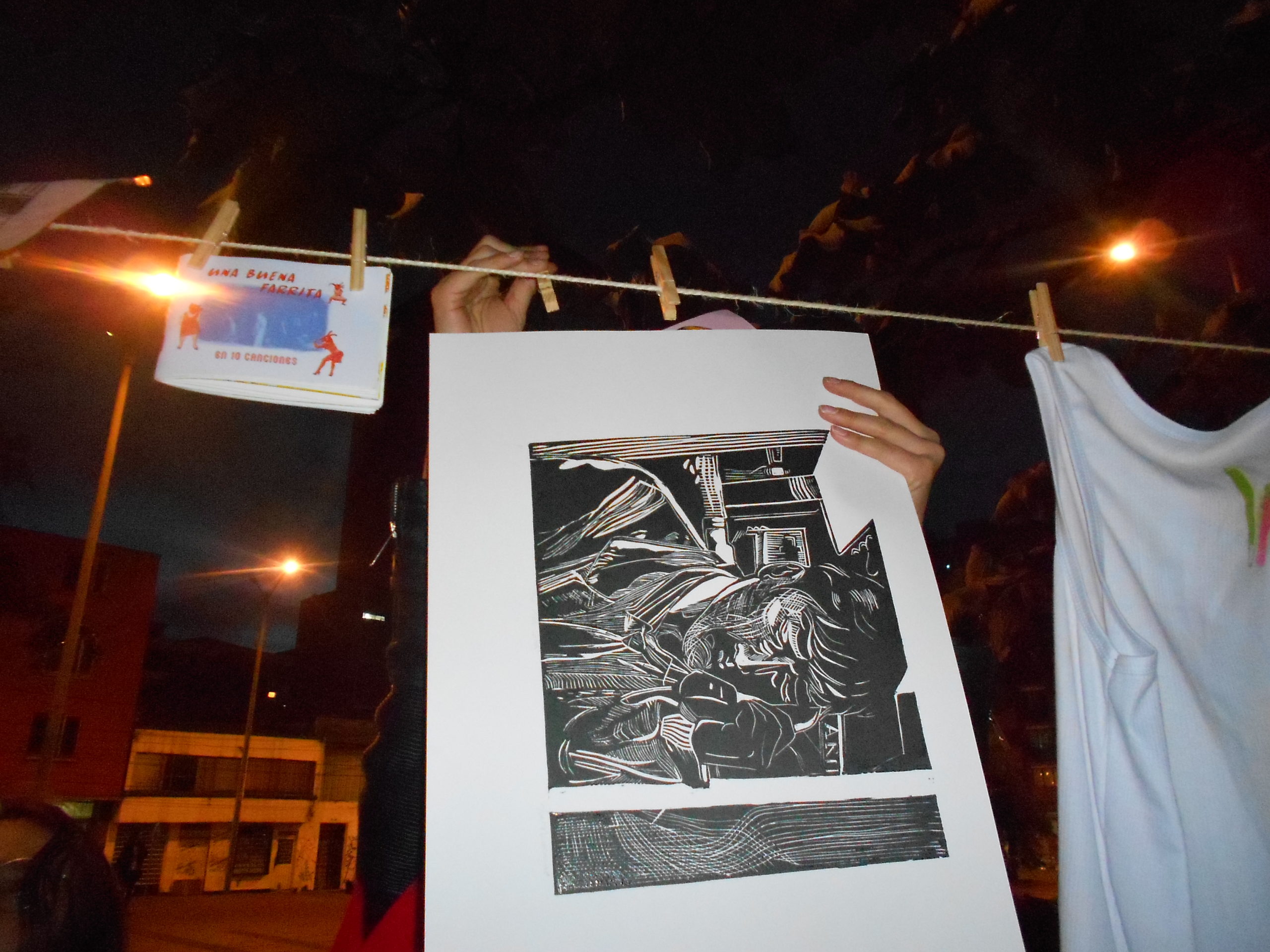 Like the last version, El colgadero began by hanging graphic pieces made by the members of the collective with an urban and underground theme. Later, it began to nourish itself with all kinds of objects and experiences: musicians who sang, sellers who exchanged their products for graphic pieces, students who left until their exams, artists who decided to hang their tests and copies of engravings and serigraphy and even clothes . The dynamics moved quite a bit to the point that a second rope was taut.
