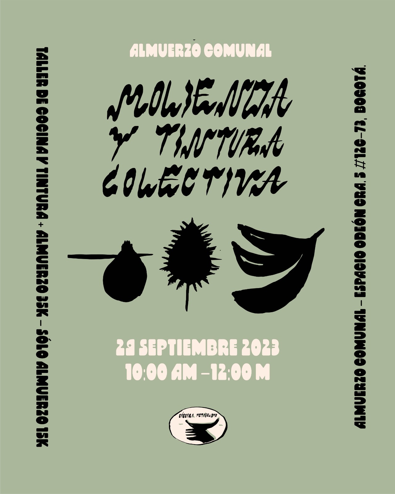 Moler es un primer metabolismo, una de las formas de acceder a las partículas de alimento que no podemos digerir por nuestra cuenta. Hoy nos relacionamos con el alimento desde la molienda y la tintura. Vamos a sumar al mortero varios tipos de pastas, de maní, de achiote, y de plátano. De nuestros morteros se desprenderan arenas, gránulos, masas blanquecinas y también pigmentos que utilizaremos para dotar de color el alimento. Siguiendo nuestros apetitos, esta arena rojiza será nuestro material tintóreo para dejar un rastro textil del relato que produzca nuestro encuentro.